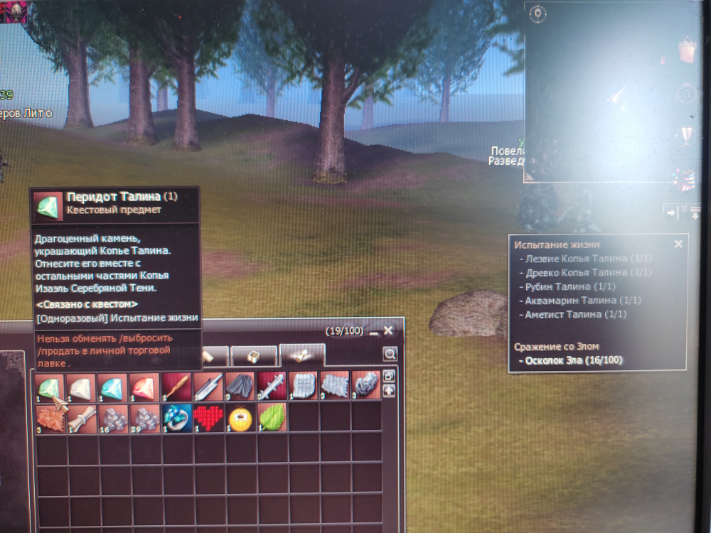 2. При прохождении 15 ой части квеста где надо выбивать предметы с лизардманов шаманов и оверлордов при оповещении квеста на экране нет строчки с предметом "Перидот талина". тоесть в оповещении показывает что все предметы добыты я полетел сдавать и не мог понять почему не сдается а оказалось что надо еще 1 предмет добыть который не указал в оповещении...