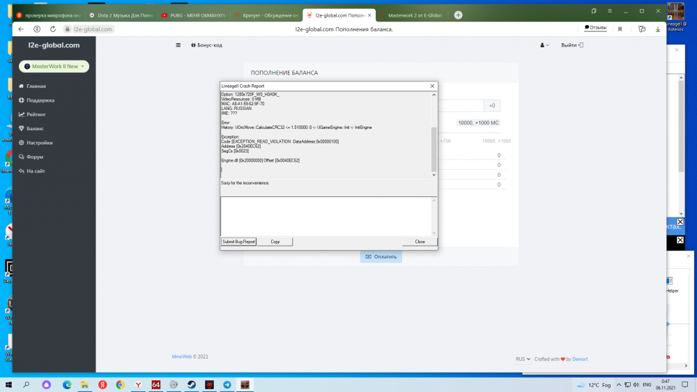Кстати клиент весит 1.45гб.... Version: EP30_Global,NLS,V2110409,110 BuildDate: Mon Jul 17 12:30:55 2017 Time: 2021.11.6 00:50:25 [GTick=1,LGTicks=1] PosCode: 0:0:0 ZoneName: OS: Windows 10(64) 10.0 (Build: 9200), Service Pack 0.0 CPU: AuthenticAMD AMD FX(tm)-6300 Six-Core Processor @ 3507 MHz RAM: 8175MB RAM CPUInfo: 6,3,6,0 Memory: 159019KB Video: NVIDIA GeForce GTX 1050 Ti (6679), DX v4.9r904 Option: 1280x720F_W0_H0A0K_ VideoResources: 0 MB MAC: A8-A1-59-62-9F-70 LANG: RUSSIAN IME: ??? Error: History: UOrcMove::CalculateCRC32 <+ 1.510000::0 <- UGameEngine::Init <- InitEngine Exception: Code [EXCEPTION_READ_VIOLATION DataAddress:0x00000100] Address [0x2040EC62] SegCs [0x0023] Engine.dll [0x20000000] Offset [0x0040EC62]