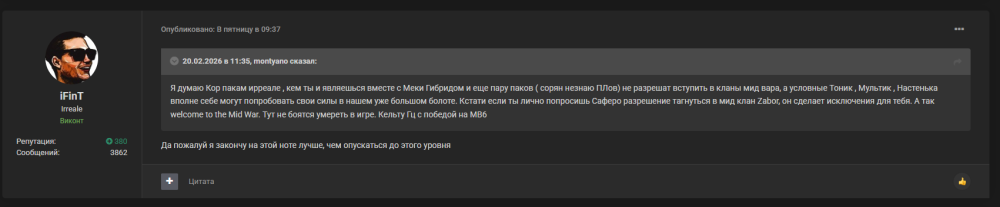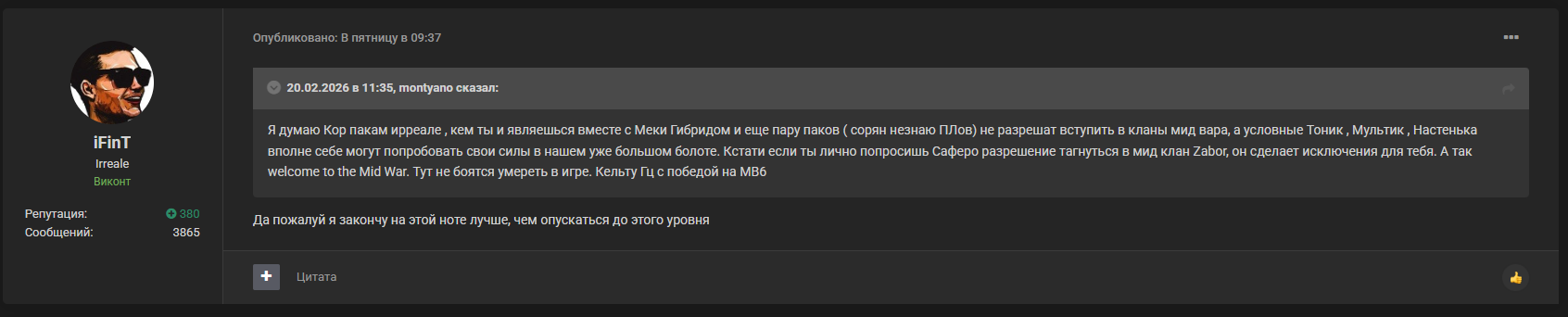 не много ли вы на себя берете, господа бигваровцы? ситуативно тагаться в мидвар чтобы конкуренты на спотах бегали без флагов, а потом рассказывать что другие обязаны соблюдать правила. в первую очередь за собой следите, тагаться в мидвар на одну осаду, а потом ретагаться обратно попахивает абьюзом системы и что-то мне подсказывает, правилами такое запрещено? как будете следить за правилами, тогда и других сможете в этом упрекать. и никакие тут "ВАМ БЫЛО СКАЗАНО" непрокатит, пока вы сами нарушаете любые правила. одним значит можно нарушать правила, а другие пожалуйста следуйте им не смотря ни на какие обстоятельства. не слишком ли вы ахуевшие? сиди в своем ебучем бигваре и не лезь к нам со своим уставом. если скучно - ливай к хуям собачим