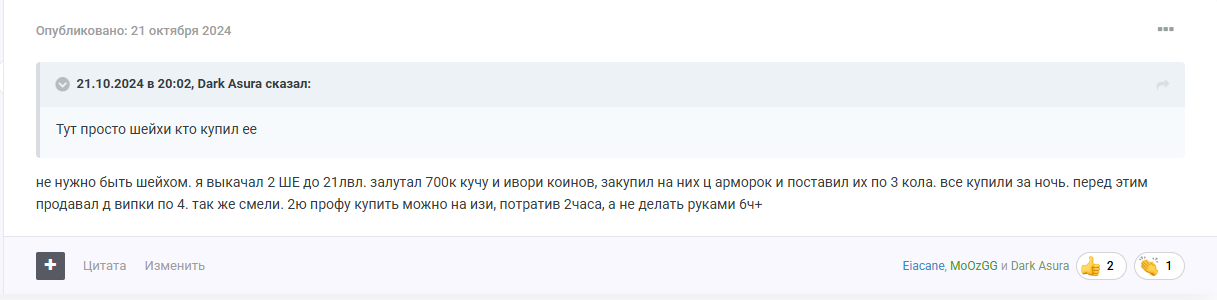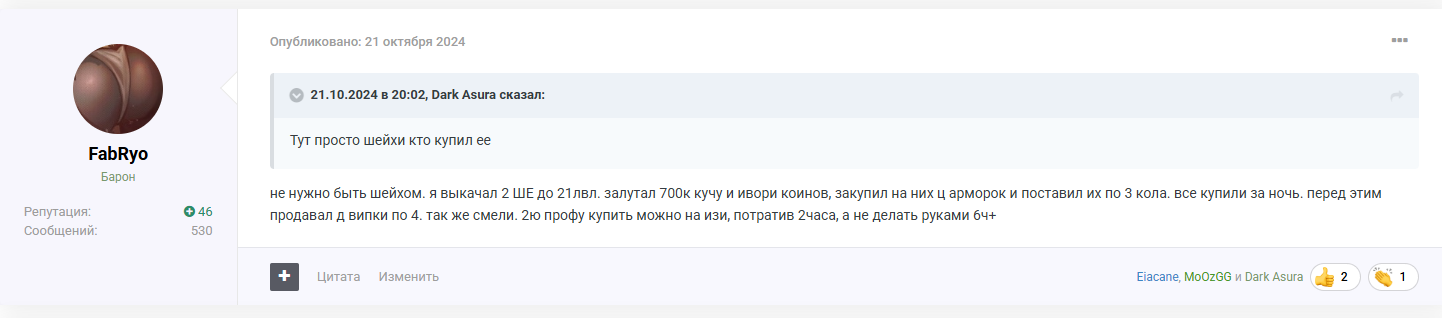 не нужно быть шейхом. я выкачал 2 ШЕ до 21лвл. залутал 700к кучу и ивори коинов, закупил на них ц арморок и поставил их по 3 кола. все купили за ночь. перед этим продавал д випки по 4. так же смели. 2ю профу купить можно на изи, потратив 2часа, а не делать руками 6ч+