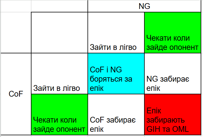 Safinar 1 Опубликовано: 22 часа назад Рассказать Опубликовано: 22 часа назад 21.11.2025 в 18:23, Feels сказал: Дак вы нас загоняли на врагов, мы решили что мы хотим вас загонять на врагов, вы не в ту сторону побежали - мы тоже, вот незадача. Класична задача з теорії ігор, коли обидві сторони обирають оптимальну стратегію, що призводить до гіршого результату, ніж якби була кооперація: Зеленим позначена оптимальна стратегія, червоним - рівновага Неша і найгірший результат, блакитним - найкращий результат. Оскільки, результатом наших дій, вийшла рівновага Неша (або ще No Regret результат), то дуже дивно що ви вирішили зразу ж піти на такі кардинальні кроки як затагати ККК собі. Один раз не зігралися і все - треба радикальні зміни? Дивний підхід... І зараз в нас цікава ситуація виходить. NG - найсильныший сайд, який може покласти будь-який сайд і забрати епік. CoF щось змінити не можуть і будуть грати третім номером. А для сайду GIHOML, єдиним рішенням є добір кланів в альянс. Більше того - зараз просто чудова ситуація, щоб затагати пів сервера, зібрати два фул СС і фріфармити усе. Гейти будуть фріфармить епік, а CoF піде фріфармить Дента. Ідеально. donskor 1 Цитата Ссылка на сообщение Поделиться на других сайтах More sharing options...